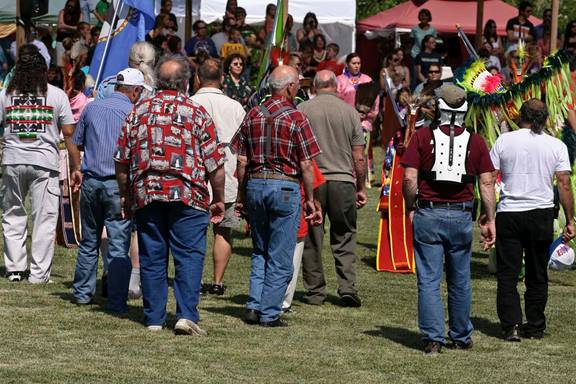 Le pow-wow commence par une procession autour du tambour sacré qui rythme la cérémonie. Chaque membre, chaque groupe au sein de la communauté, hommes, femmes, et enfants, y jouent un rôle et y trouvent sa place. Au cours de la cérémonie, on invitera divers participants à faire un tour de piste pour célébrer un événement, souligner une occasion, célébrer ou valoriser des exploits. À un moment donné, le maître de cérémonie invite les membres des forces armées, en service actif autant que les vétérans, à faire un tour de piste, afin de recevoir une marque de reconnaissance de la part des personnes présentes. Quelques personnes répondent à l’appel. Puis, il encourage toutes les personnes présentes qui ne sont pas autochtones à se joindre à la ronde, en ajoutant que ces personnes méritent cette reconnaissance que leur gouvernement ne leur accorde pas.