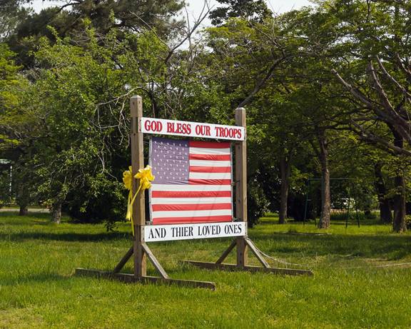 Des sections de routes et d’autoroutes honorent les militaires : le Purple Heart Memorial Highway, le Blue Star Memorial Highway et un Freedom Highway en Caroline du Nord. Cet état s’affiche publiquement comme étant le plus cordial à l’égard des militaires. De plus, je commence à dénoter des marques d’association entre le militarisme et la religion. Dieu est appelé à veiller sur les troupes de l’empire.