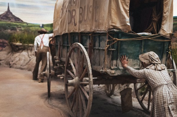 On accède à ce panorama via un grand escalier, comme si on pénétrait dans un territoire imaginaire. Puis on suit un sentier entre les dioramas, tous minutieusement conçus, et réalistes : on se croirait présent dans le paysage… côtoyant les pionniers qui conduisaient les caravanes de charriots tirés par des bœufs ou des mules il y a plus d’un siècle et demi ; ou, plus près de nous dans le temps, on jurerait se retrouver dans un restaurant de bord de route, un diner, comme on en retrouve toujours ici et là, mais de moins en moins, vestiges typiques d’il y a un demi-siècle.
