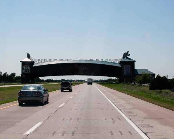 Trois heures après avoir quitté les banlieues d’Omaha, nous nous approchons de la prochaine étape de notre itinéraire : Kearney. Loin à l’horizon, nous distinguons progressivement une structure intrigante qui surplombe l’autoroute. Le Great Platte River Road Archway n’est pas un obstacle : c’est un monument. Il ne pouvait y avoir de meilleur endroit pour célébrer ce grand mythe américain : l’autonomie du déplacement, la liberté que représente la Route, la conquête du temps… au milieu de nulle part.