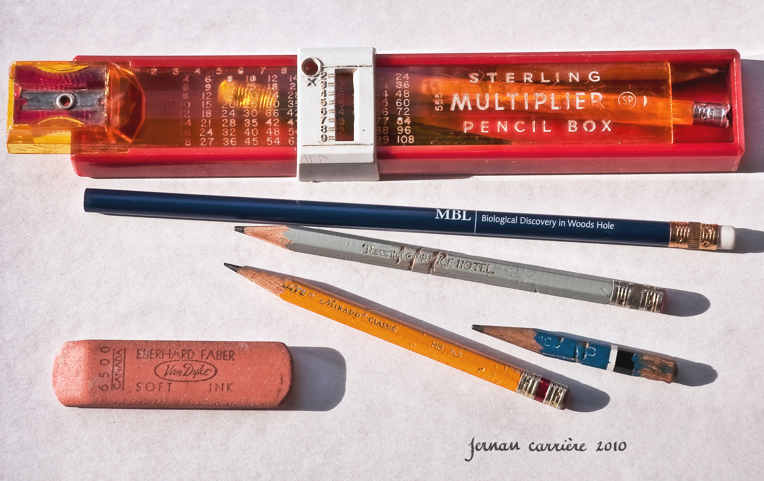 J’ai retrouvé dans une multitude de tiroirs dispersés dans notre domicile, de vieux stylos-bille, des crayons, des porte- mine, des effaces, des taille-crayon,  des règles, que j’avais conservés parce que j’y étais attaché.