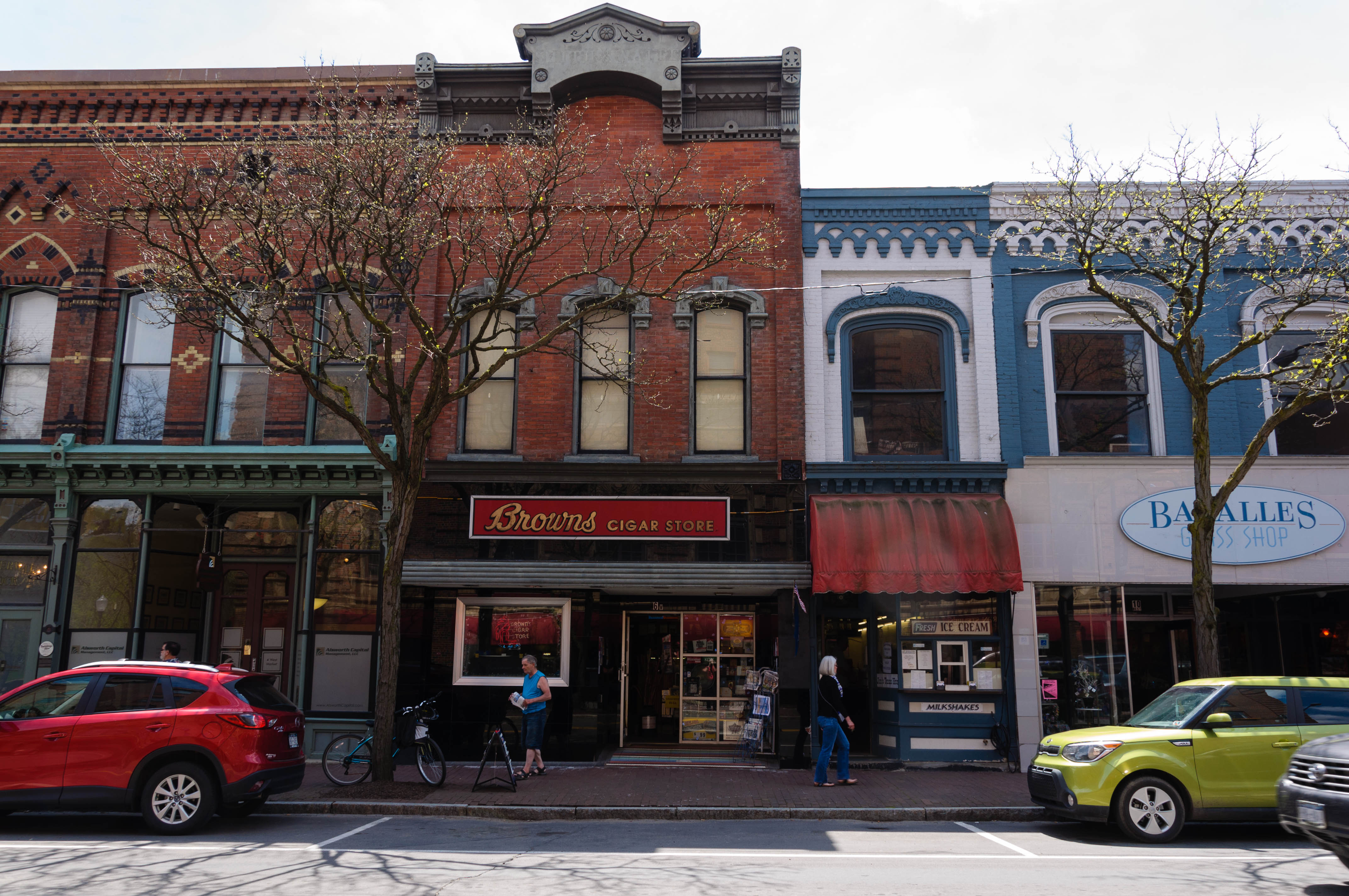 L’ancienne tabagie, et la crèmerie coincée entre deux édifices, sur Market Street, à Corning