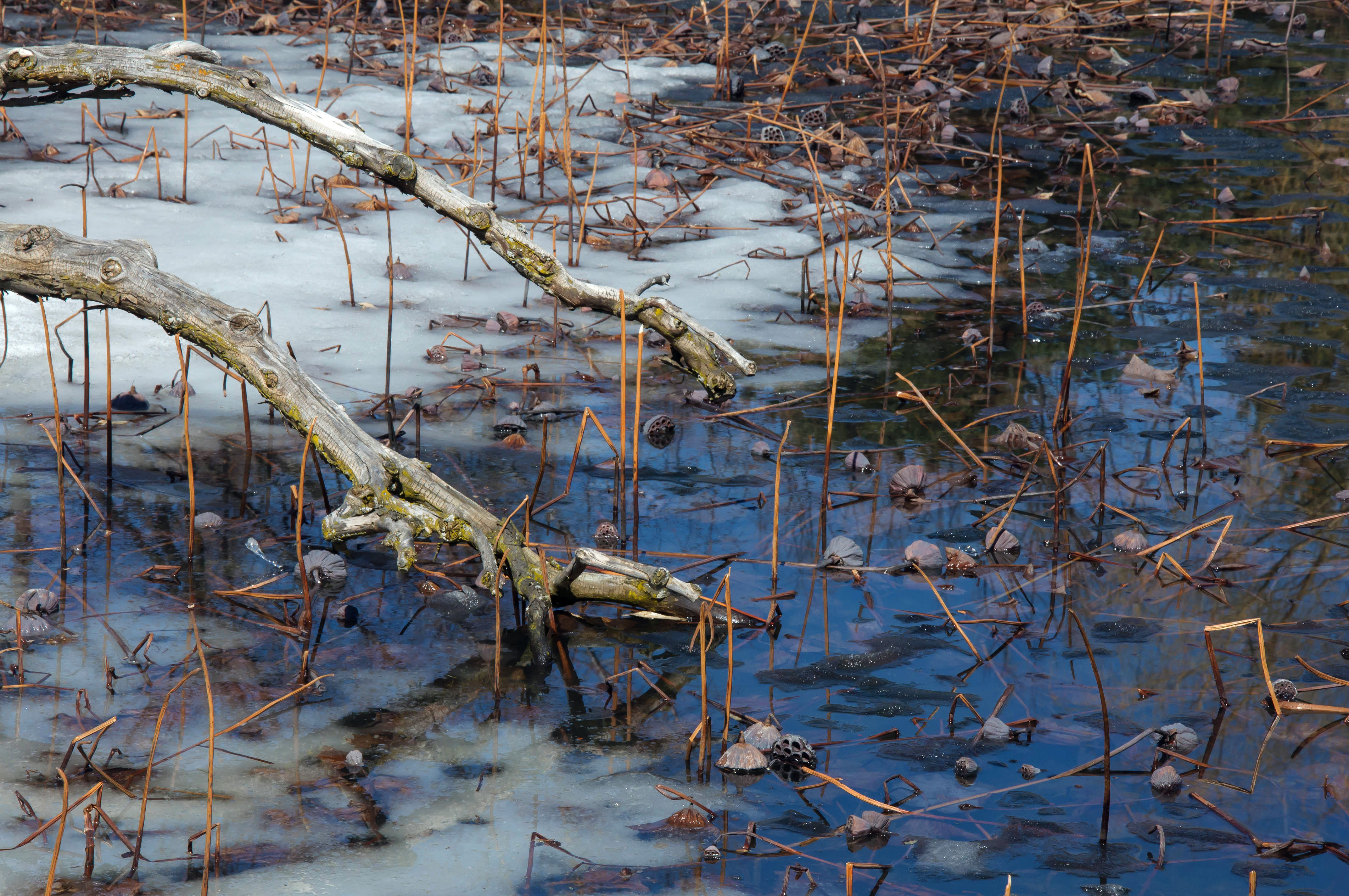 Les fruits du lotus d’Orient, pris dans une glace fondante, à la fin de l’hiver