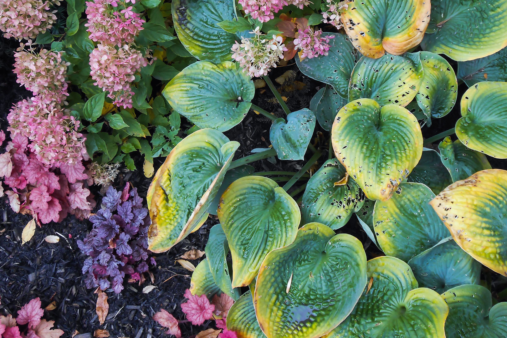 Des hostas capturent des rayons d’un soleil de plus en plus bas à l’horizon…