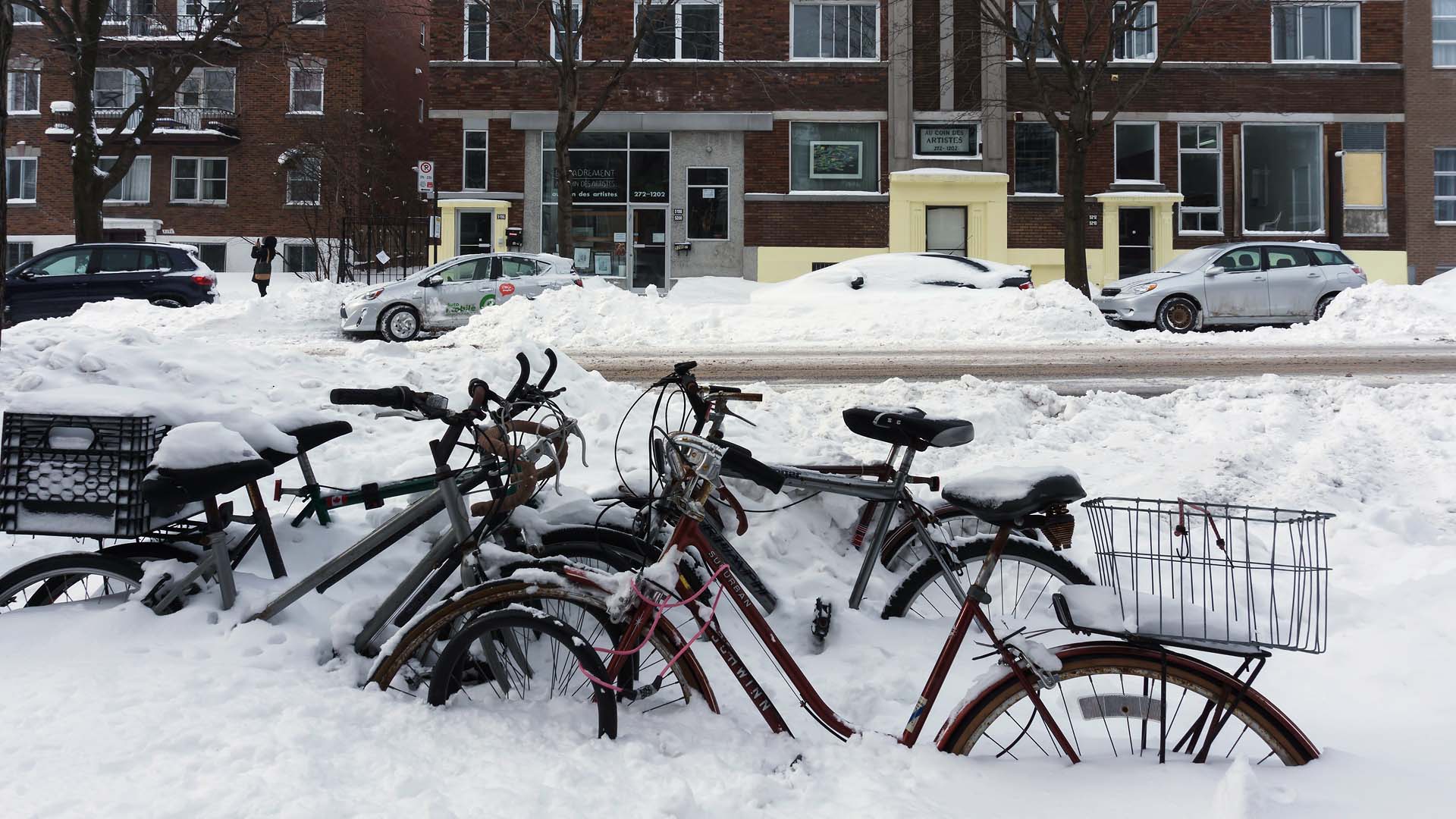 Enfin ! une première neige saupoudre le paysage de Montréal ce matin : un mince tapis couvre la ville — quelques centimètres tout au plus, pas assez pour le ski, mais trop pour le vélo.