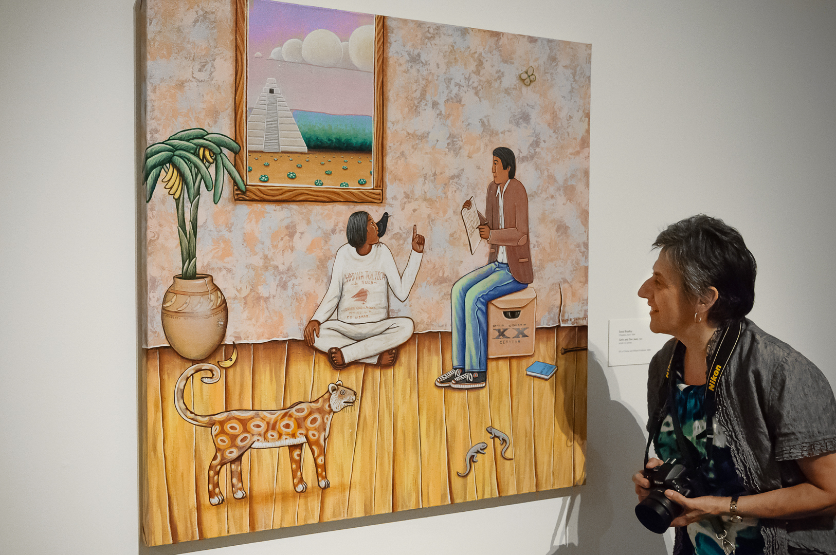Le gouvernement américain a pratiqué une politique délibérée et consciente d’ethnocide jusque dans la première moitié du siècle dernier. Ce n’est qu’avec l’avènement de l’American Indian Movement dans les années 70 que la tendance a été renversée. Il serait trop long pour moi d’illustrer mon propos ici. Je ne présenterai qu’une œuvre, récente, qui démontre l’esprit et l’humour subtil des membres des nations autochtones de l’Amérique du Nord. Dans ce tableau, l’artiste David Bradley évoque le travail de l’anthropologue Carlos Castañeda, qui a publié une série de livres sur les enseignements d’un sorcier yaqui il y a quelques décennies.